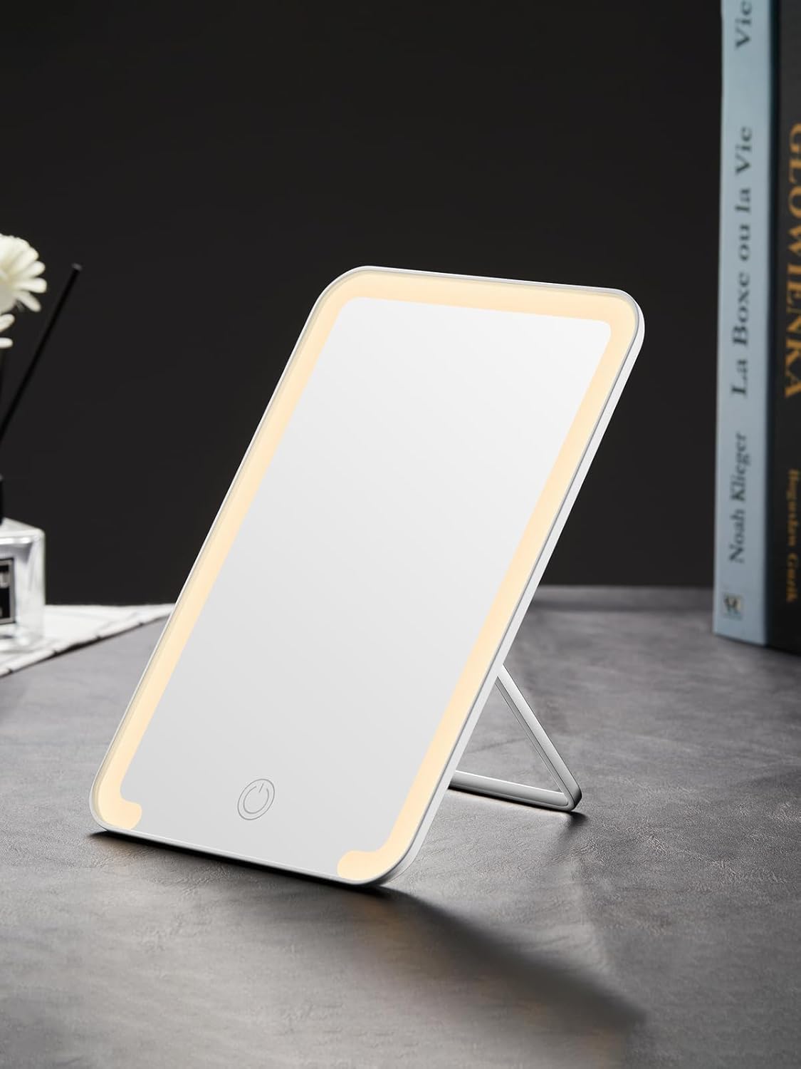 OMIRO Lighted Travel Makeup Mirror, 8 x 5 inches Desk Mirror with Foldable Stand and 3 Lighting Modes for Shaving and Travelling, White