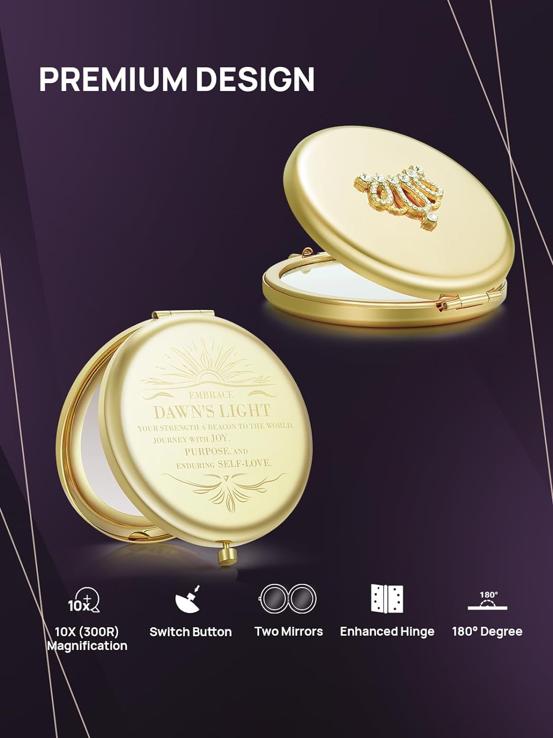 - 【2 Different Design】The outer shell of the mirror has 2 unique designs. One side is made of sparkling diamonds Crown, while the other side is engraved words " Embrace dawn's light your strength a beacon to the world. Journey with joy, purpose, and enduring self-love. "