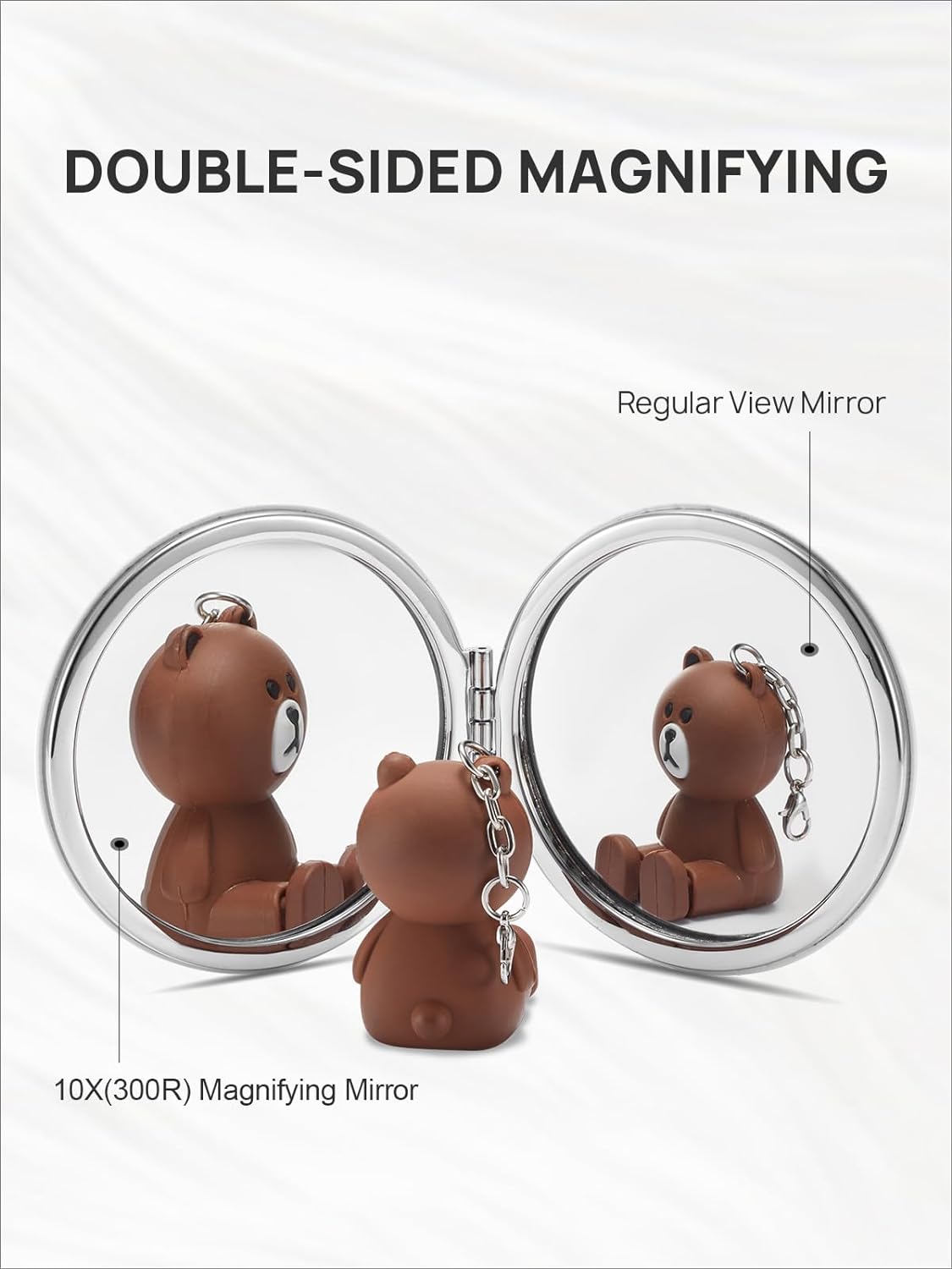 - 1X & 10X(300R) MAGNIFICATION: A double-sided mirror suitable for cosmetic use. The main mirror perfectly reflects a clear image of the whole face, while the other side is 10X(300R) magnified and is great for applying mascara, tweezing, plucking, flossing, etc.