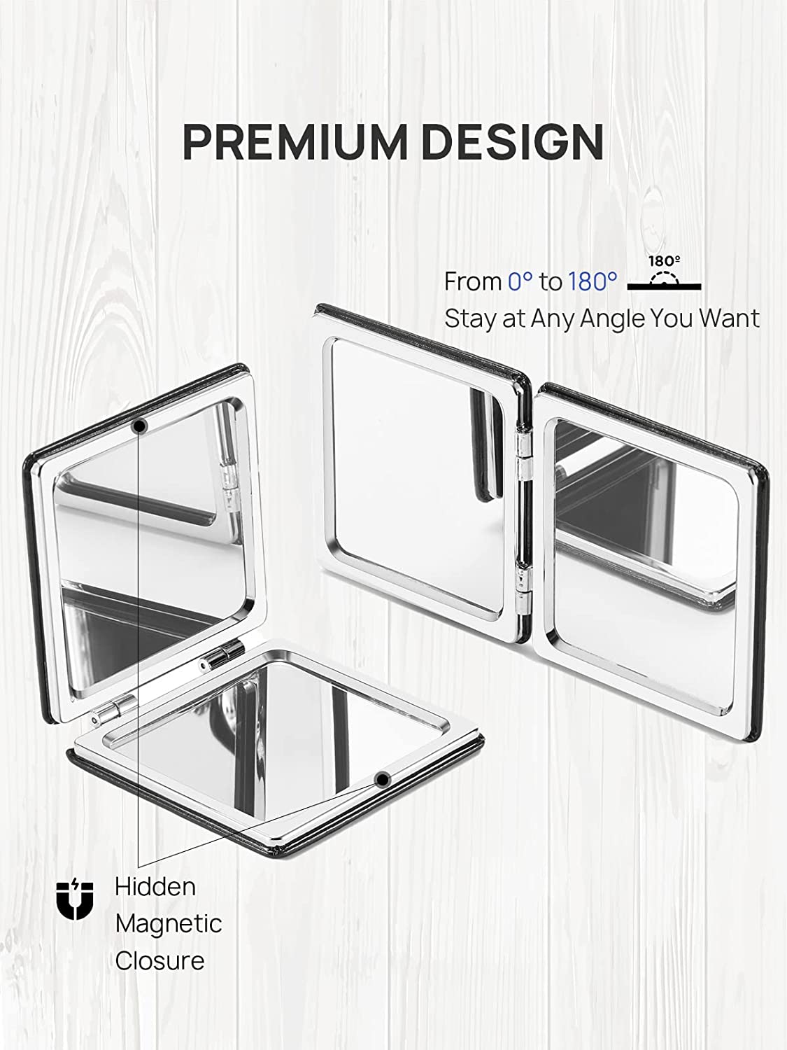 - FULLY ADJUSTABLE & MAGNETIC CLOSURE: It has two hidden magnetic buckles that serve as a closure. Its hinge allows you to open the mirror to a 180-degree angle when laid flat on a surface.