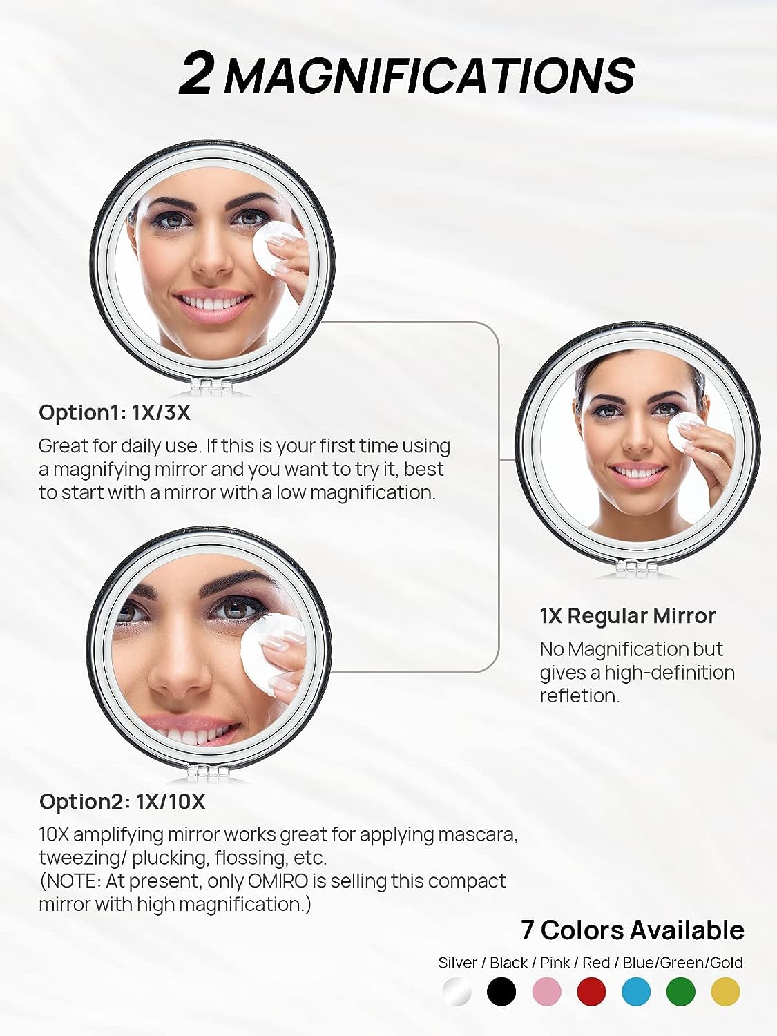 - 1X & 10X MAGNIFICATION: A two-sided mirror suitable for cosmetic use. The primary mirror perfectly reflects a clear image of the entire face while the other side is 10x magnified and is excellent for applying mascara, tweezing, plucking, flossing, etc.