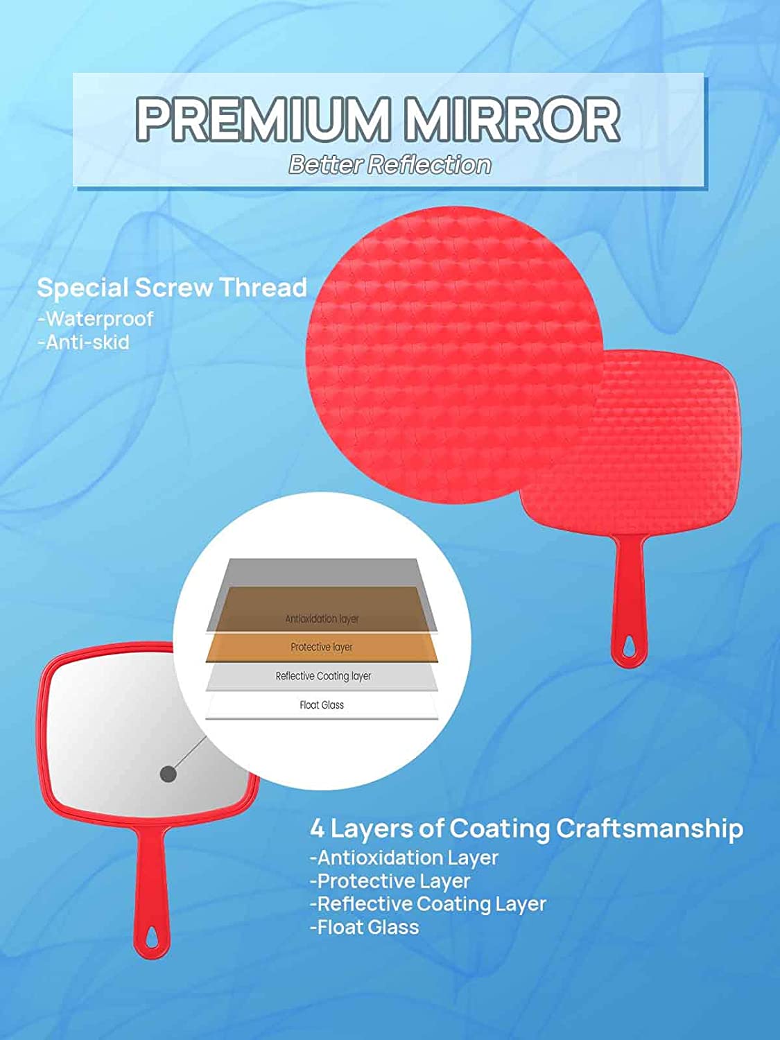 - PREMIUM HANDHELD MIRROR: 4 layers of coating craftsmanship for better reflection. It has a superior screw thread design for an anti-skid mechanism—an excellent tool for a haircut.
