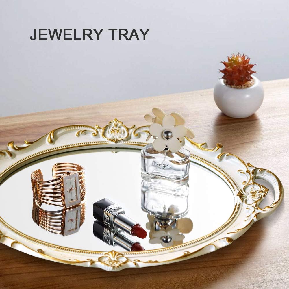 - DECORATIVE MIRROR TRAYS - The decor mirror tray design with a delicate floral pattern will perfectly match any desktops & other decorations, that can be used as a jewelry tray or as a fruit plate for wedding receptions, even as a serving tray (to avoid immediate contact with food).