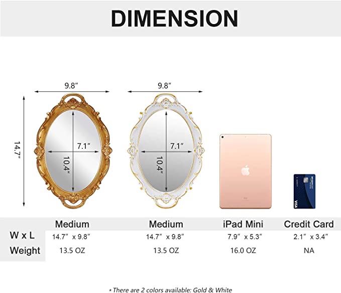 - 2 WAY USAGE- Lightweight, there a small hook is equipped on the backside for easy mounting, you can hang the mirror for use or as decoration for the wall. Or as an elegant mirror tray, showing your things in a new style and adding a graceful touch.